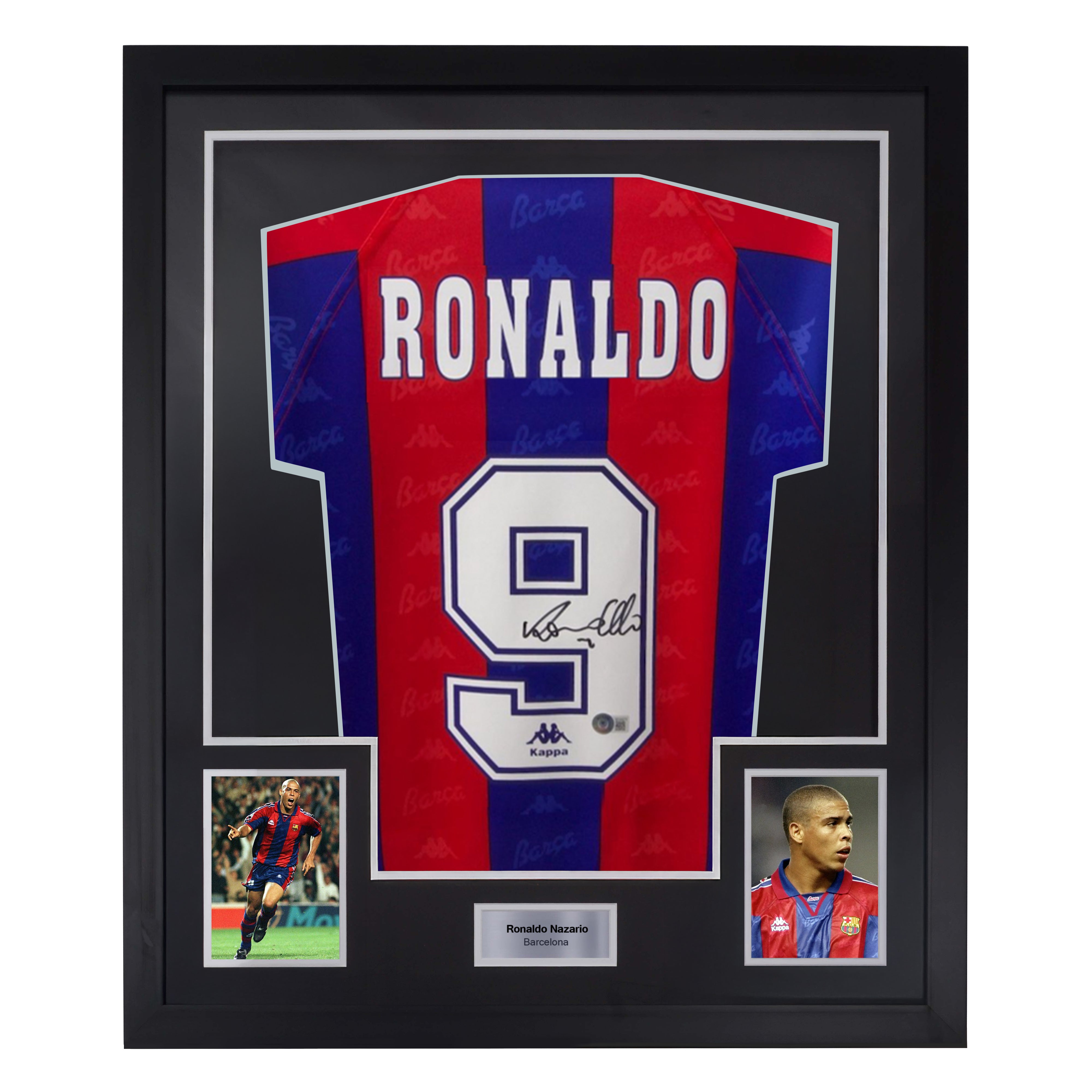 Framed Ronaldo Nazario Signed FC Barcelona Home Soccer Jersey #9 with Beckett COA