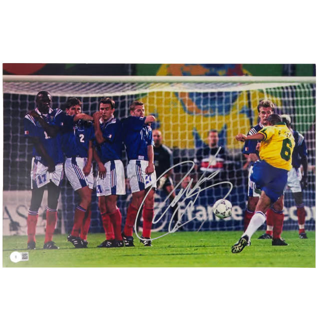 Roberto Carlos Signed Iconic Goal Soccer Print Size 7″ x 11″ with Beckett COA
