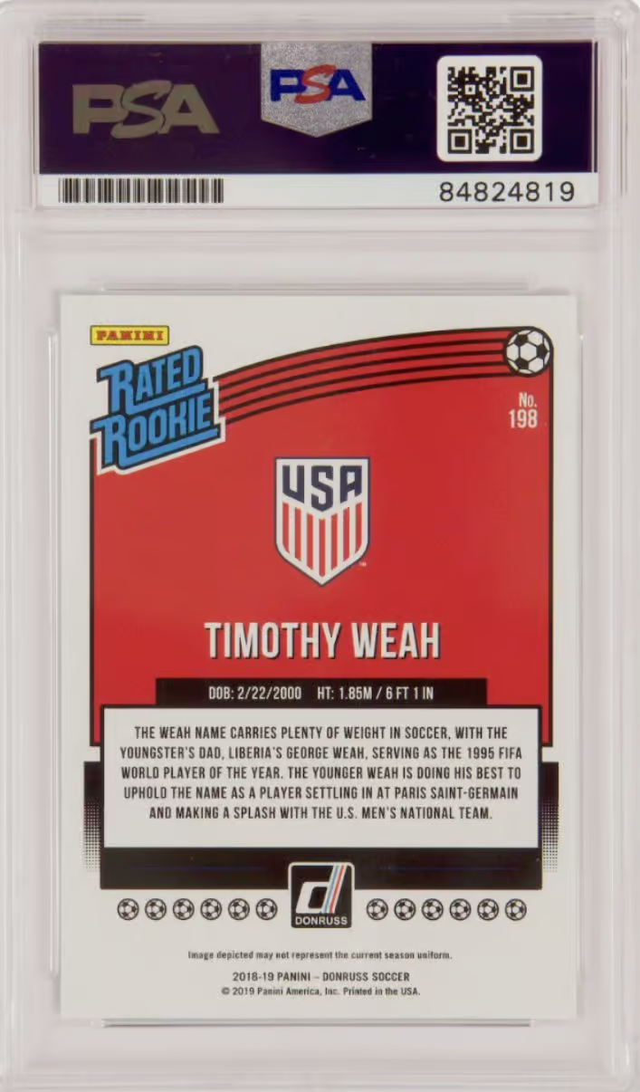 Timothy Weah Signed 2018-19 Panini Donruss Rated Rookie #198 – PSA 10 Autograph