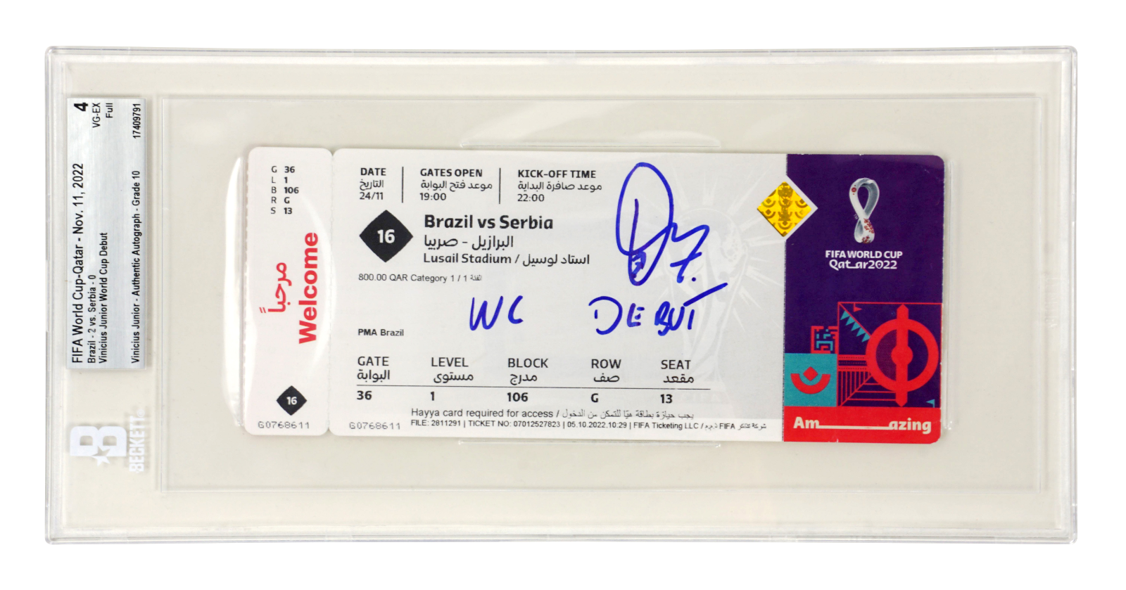 Vinicius Jr Signed 2022 FIFA World Cup Debut Match Ticket Inscribed – BGS 4